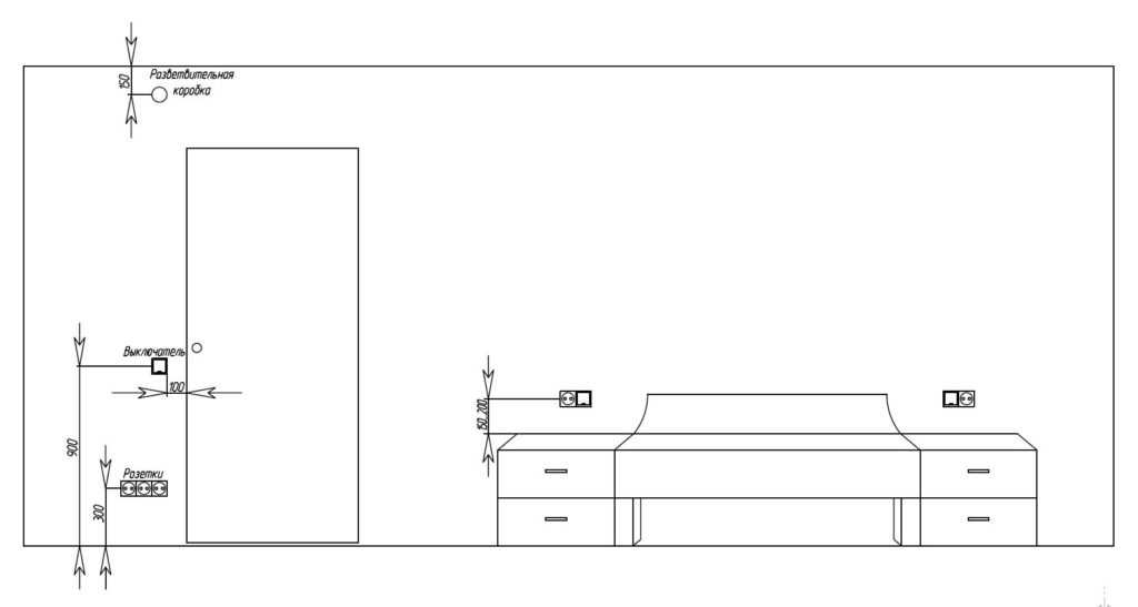 Следуя этой схеме, стоит подбирать наиболее комфортную высоту изделий. Если не создать точную схему и ставить электророзетки наугад, часть из них может быть скрыта массивными объектами и стать непригодными для использования.