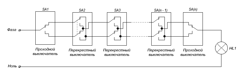 Схема подключения 2-х проходных и перекрёстного выключателей для управления освещением из 3-х точек
