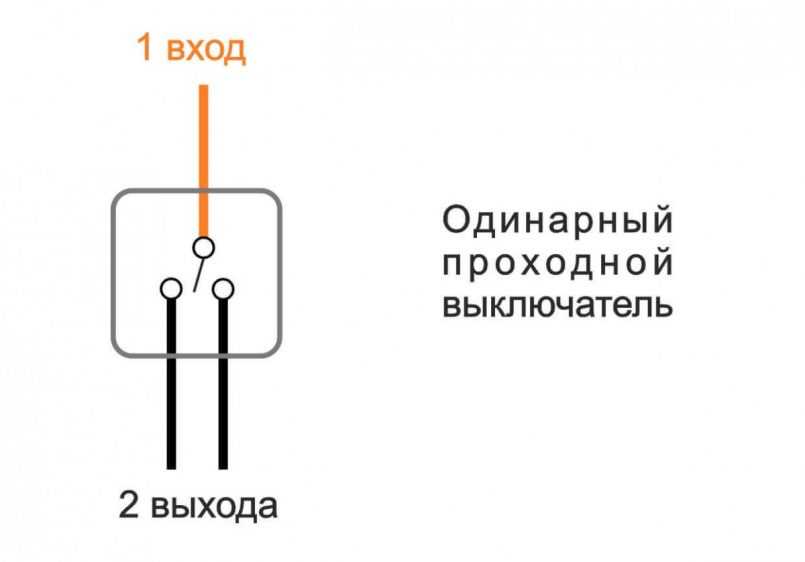 А вот у одноклавишного проходного выключателя их 3: фазный провод от главного питающего кабеля (вход) и 2 отходящих фазных провода.