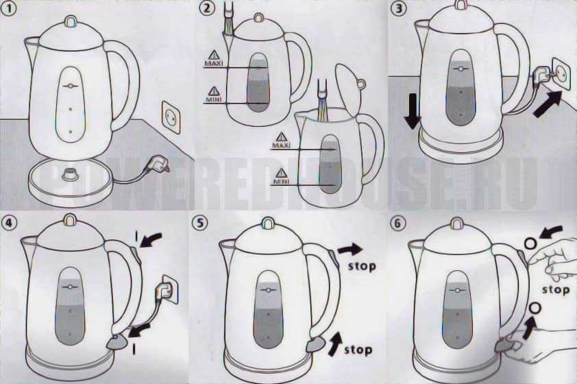 - Не погружайте чайник или базу в воду. Обеспечьте сухость всех электрических контактов.