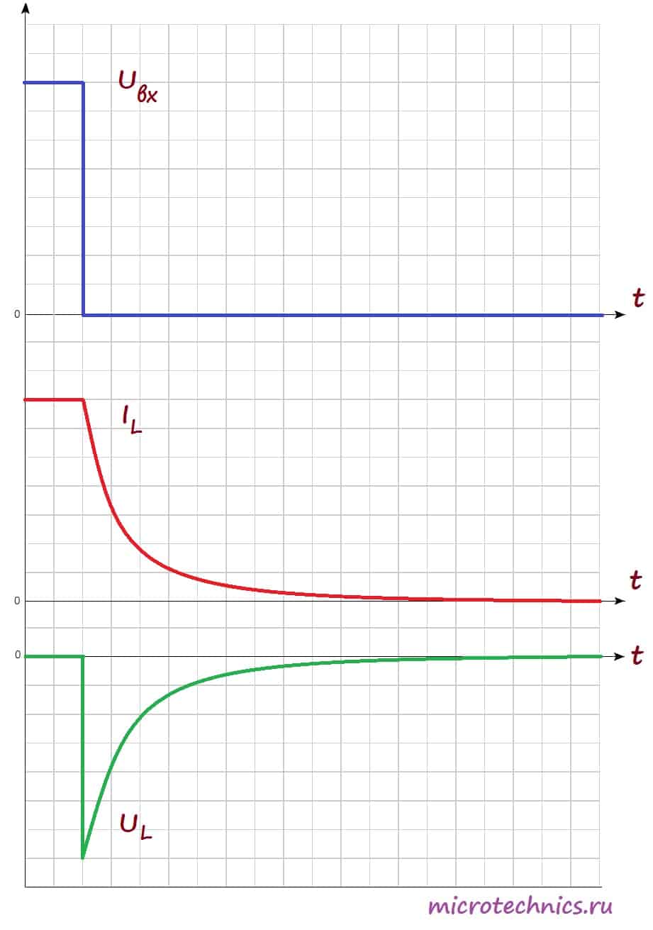 После размыкания ключа возникает ЭДС самоиндукции, которая препятствует уменьшению тока через катушку, поэтому ток достигает нулевого значения не сразу, а по истечении некоторого времени. Напряжение же в катушке по форме идентично случаю замыкания переключателя, но противоположно по знаку. Это связано с тем, что изменение тока, а соответственно и ЭДС самоиндукции в первом и втором случаях противоположны по знаку (в первом случае ток возрастает, а во втором убывает).