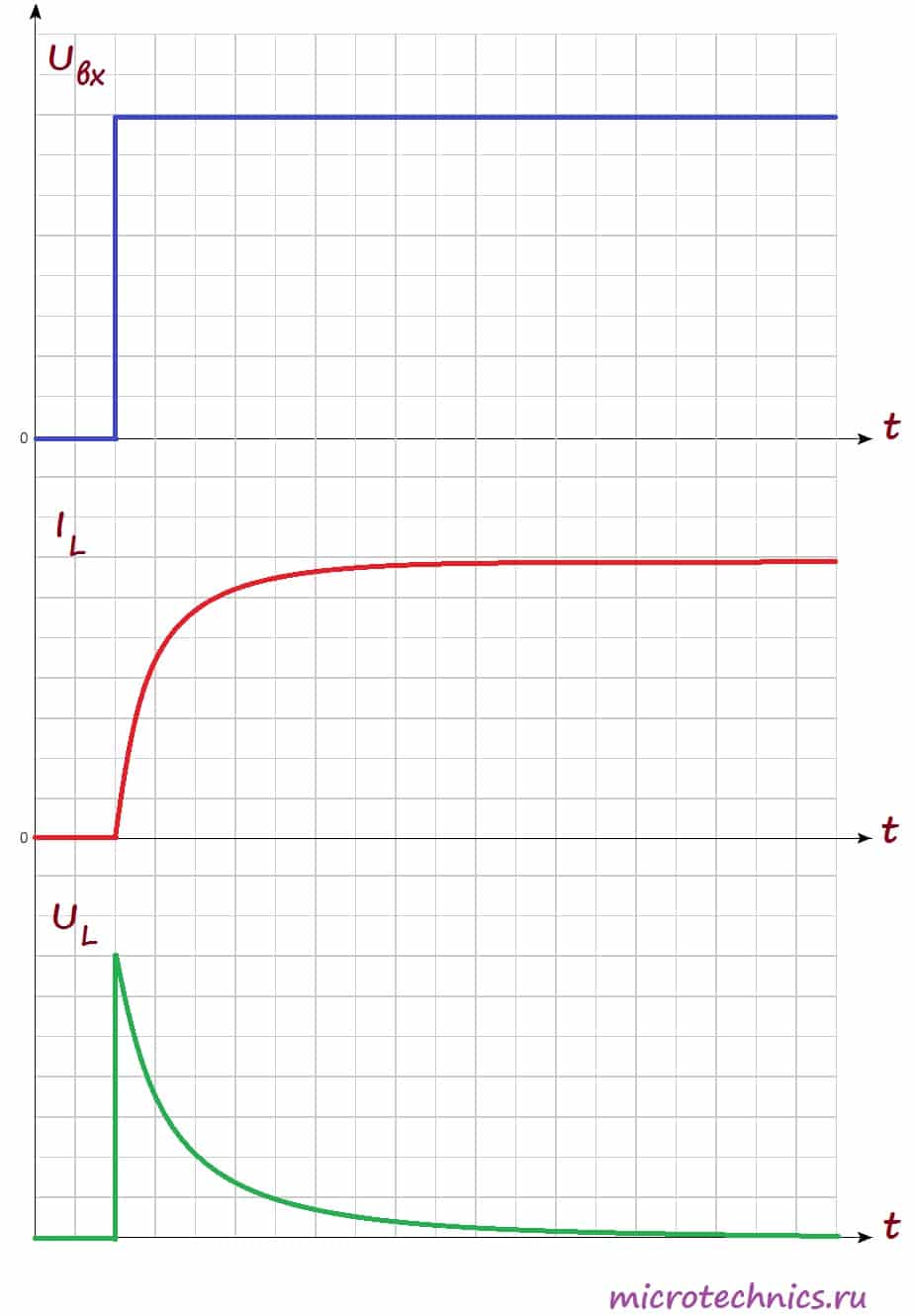 Возникновение ЭДС приведет к появлению индукционного тока в катушке, который будет протекать в направлении, противоположном направлению тока источника питания. Таким образом, ЭДС самоиндукции будет препятствовать протеканию тока через катушку (индукционный ток будет компенсировать ток цепи из-за того, что их направления противоположны). А это значит, что в начальный момент времени (непосредственно после замыкания выключателя) ток через катушку I_L будет равен 0. В этот момент времени ЭДС самоиндукции максимальна. А что же произойдет дальше? Поскольку величина ЭДС прямо пропорциональна скорости изменения тока, то она будет постепенно ослабевать, а ток, соответственно, наоборот будет возрастать. Давайте посмотрим на графики, иллюстрирующие то, что мы обсудили:
