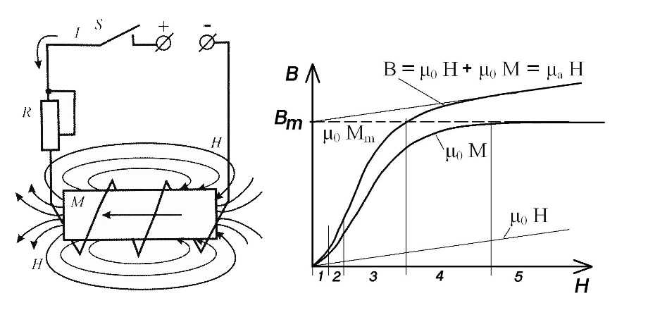 После снятия напряжения с катушки напряженность магнитного поля падает до нуля. Это участок на графике 1-2. При этом материал за счет направленности магнитных моментов остается намагниченным. Но величина намагниченности несколько ниже, чем при насыщении. Если такой эффект наблюдается в веществе, то оно относится к ферромагнетикам, способным накапливать в себе магнитное поле за счет сильных магнитных связей между молекулами вещества.