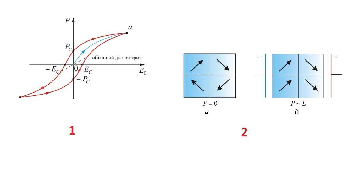 На второй части (2) изображено хаотичное (а) и направленное (б) расположение доменов. Ориентацию вдоль линий электростатического поля применяют для создания конденсаторов с изменяемой емкостью.