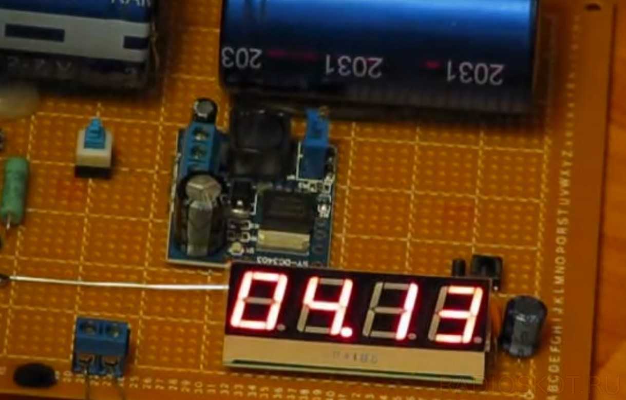 В батарее конденсаторов работают два элемента, каждый емкостью 400 фарад и напряжением 2,7 В, соединенных последовательно. Это обеспечивает максимальное напряжение 5,4 В и результирующую емкость 200 фарад. Для питания преобразователя постоянного тока требуется напряжение 3,4 В, поэтому данное решение является идеальным — даже если напряжение на конденсаторах упадет с 5,4 до 3,4 В — преобразователь будет работать без проблем. Для удобства использовалась кнопка, позволяющая переключать вольтметр между выходом источником питания преобразователя или проверка состояния заряда конденсаторов.