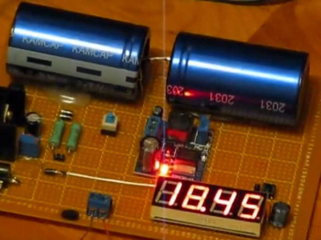 Схема основана на суперконденсаторах, емкость которых во много тысяч раз превышает обычные электролитические конденсаторы (1-3000 фарад), что делает их хорошими накопителями тока. В данном варианте использовались 2 конденсатора по 400 фарад, соединенных последовательно, что дает напряжение 5,4 В для питания преобразователя постоянного тока. Также схема оснащена зарядным модулем и цифровым вольтметром — индикатором напряжения на выходе.