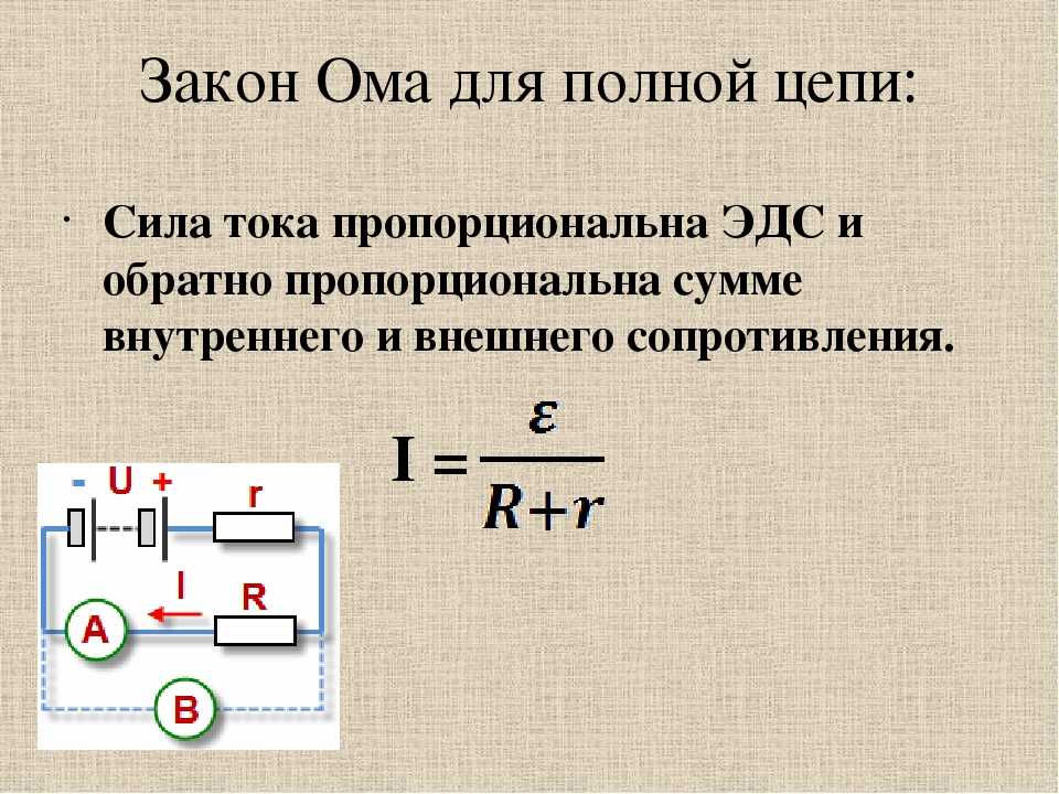 Для полной цепи закон формулируется иначе: ток I прямо пропорционален ЭДС (E) и обратно пропорционален алгебраической сумме внешнего R и внутреннего r сопротивлений. Следует отметить, что r — проводимость источника питания. Записывается он в таком виде: I=E/(R+r). Физики вывели следующие соотношения, помогающие при расчетах: