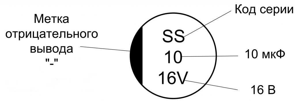 Электролитические конденсаторы этого типа, как правило, имеют относительно большие размеры, поэтому многие параметры таких элементов указываются без шифрования. То есть максимальное значение напряжения будет указано цифрой и буквой «V», а емкость — mF.