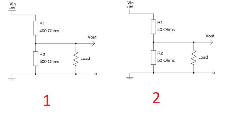 На первой части рисунка изображен типовой делитель, обеспечивающий выходное напряжение 5 V. При потреблении тока 0,01 А сопротивление нагрузки составит 0,5 кОм. Пользуясь формулой расчета для параллельной цепи, несложно выяснить суммарное значение R = 1/(1/R2 + 1/Rнагрузки) = 0,25 кОм. Это добавление уменьшит плановое значение Uвых до 3,46 V.