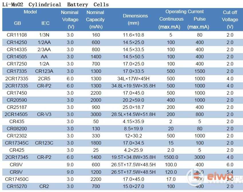 - Предельное напряжение разряда: 2.5 В