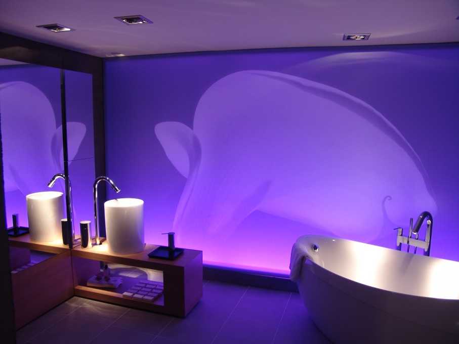 Достаточно оригинальный способом украшения ванной является освещение мебели и ванны. Современные дизайнеры изо дня в день придумывают новые необычные вещи, которые смотрятся в интерьере весьма изящно. Ванна со встроенной подсветкой является многофункциональной.