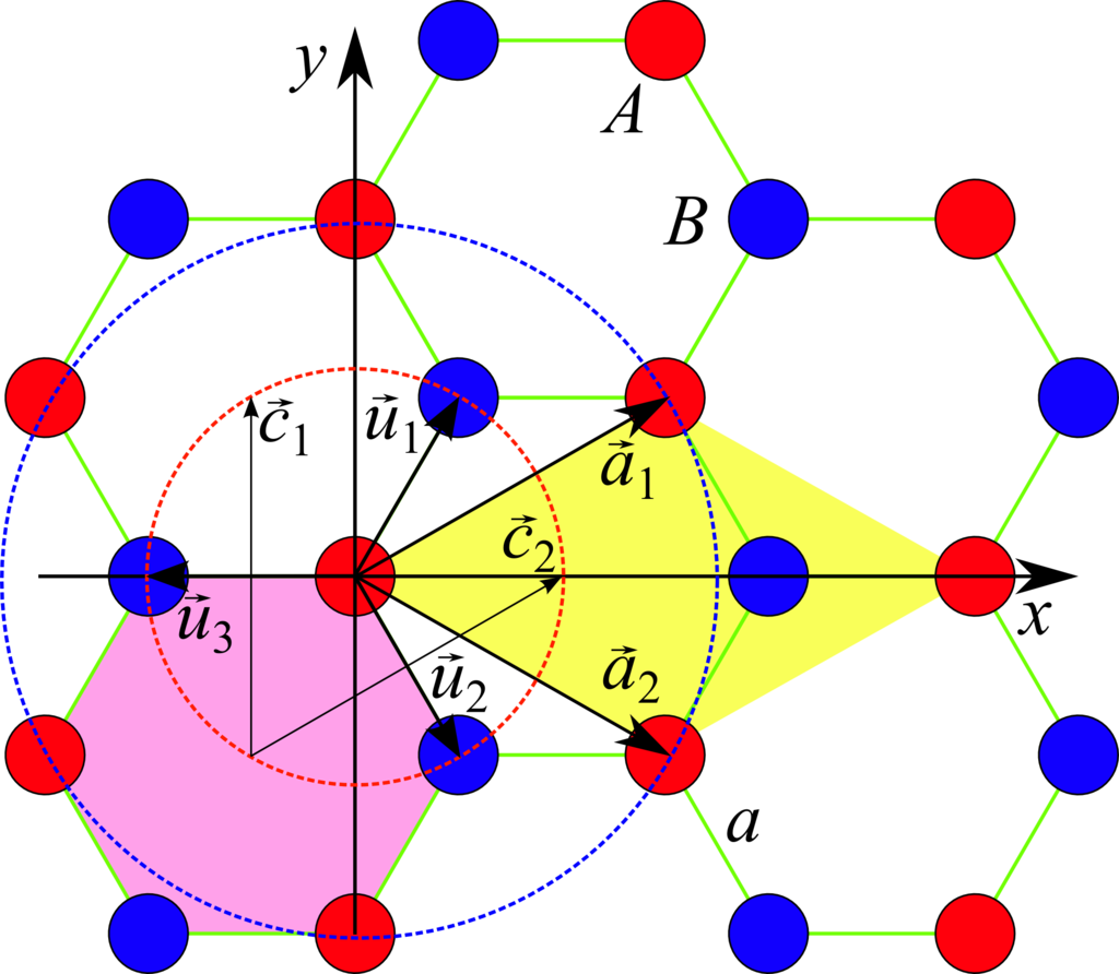 Группа правильных шестиугольников образует решётку, что отражает эквивалентную гексагональную структуру построения атомов углерода. На рисунке жёлтым фоном выделена элементарная ячейка. В кругу розового цвета видны атомы с векторами. Синие и красные кружочки отображают различные подрешётки кристалла, являющиеся базисом решётки.