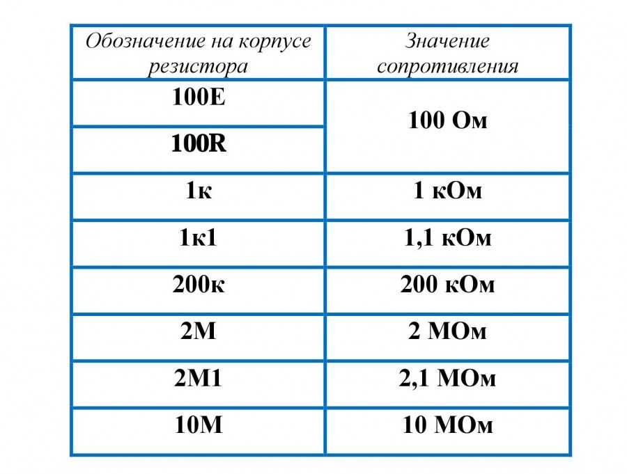 Элементы с проволочными выводами обозначаются нанесением на поверхность корпуса надписей. Числа обозначают номинал, а буквы соответствуют диапазону измерения. Буквы «E» и «R» для Ом, «K» обозначает килоом, «M» – мегом.