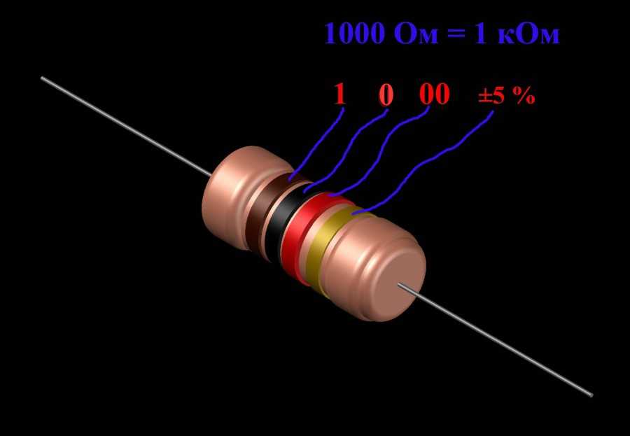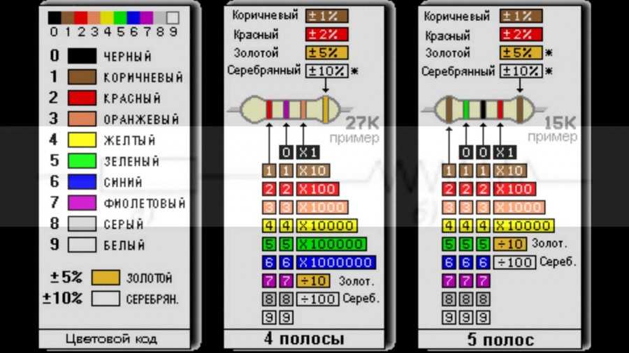 Если маркировка содержит пять полос, тогда первые три покажут величину сопротивления в омах, следующая определяет множитель, и последняя обозначает допуск.
