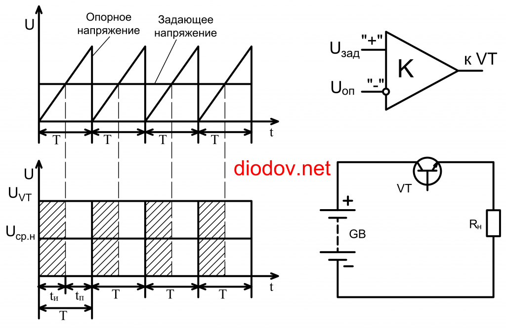 В любом случае для формирования определенной длительности импульса, подаваемого на базу транзистора и открывающего последний, применяют источники опорного и задающего напряжения, а также компаратор.Рассмотрим упрощенную схему, в которой аккумуляторная батарея GB питает потребитель Rн импульсным способом посредством транзистора VT. Сразу скажу, что в данной схеме я специально не использовал такие элементы, необходимые для работы схемы: конденсатор, дроссель и диод. Это сделано с целью упрощения понимания работы ШИМ, а не всего преобразователя.
