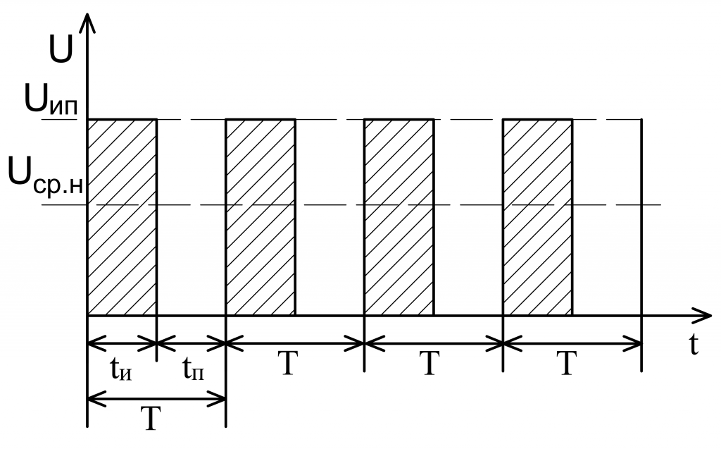 Время, в течение которого ключ замкнут, называется временем импульса tи. А время длительности разомкнутого ключа называют временем паузы tп. Если измерить напряжение на нагрузке, то оно будет равно половине Uип.