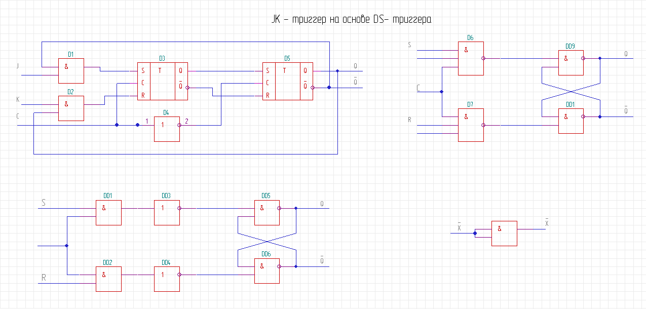 Рис. 6.8. Реализация двухступенчатого JK-триггера на основе RS-триггера (вывод схемы).