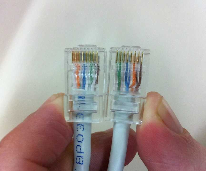 Провод должен иметь разъем для подключения в сетевые устройства. Для витой пары используется разъем RJ-45 (8P8C — 8 position and 8 contacts). Внутри коннектора есть специальные канавки с контактами для каждой жилы. Есть несколько вариантов обжима сетевых кабелей: прямой и обратный (кроссовер). Прямой патч-корд применяется для соединения компьютера с маршрутизатором или коммутатором или для соединения активного сетевого оборудования между собой. Кросовый используется довольно редко и служит для соединения двух компьютеров между собой