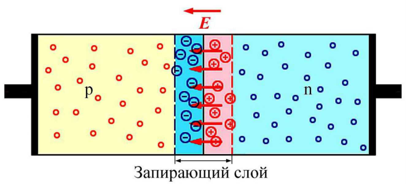 В результате физических процессов движения электронов и дырок на границе веществ возникает электрическое поле, и образуется так называемый p-n переход.