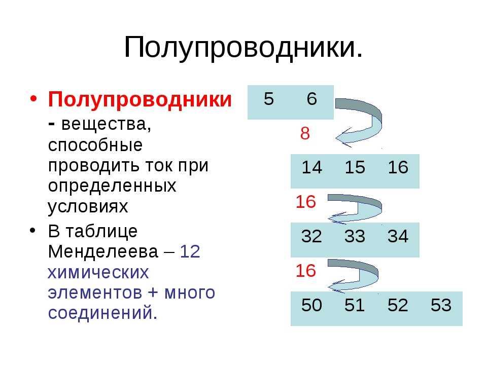 Полупроводниками считают вещества, которые обладают слабовыраженными свойствами электропроницаемости металлов и изоляторов одновременно, имеется зависимость движения тока от температуры, излучений и концентрации примесей. Группа полупроводников представляется большим количеством материалов, чем металлы и диэлектрики, вместе взятые. Имеющиеся свойства веществ уникальны: