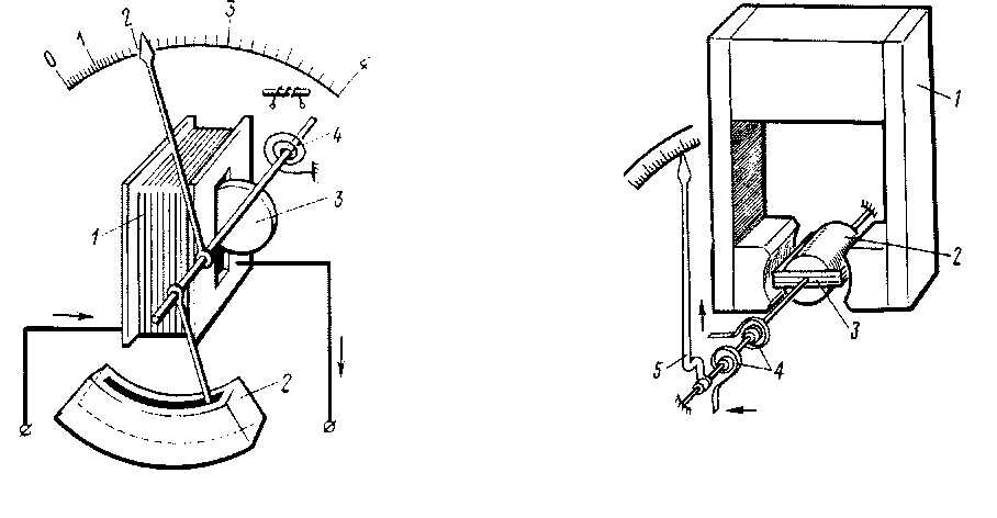 На двух схемах цифрой 1 обозначен источник поля, которое поворачивает катушку (3), жестко закрепленную на центральной оси. Устройство начинает функционировать, когда по цепи проходит ток. Спиральная пружина (4) корректирует движения. В первом варианте установлен ограничитель (2), предотвращающий повреждение стрелки.