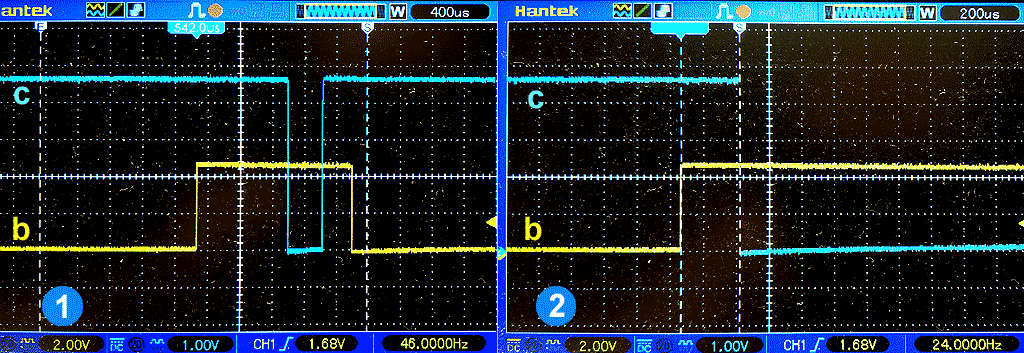 На Рисунке 3.2 показана осциллограмма стационарного процесса, когда освещенность фотоприемника DD2 достаточна и фронт выходного импульса сдвинут относительно фронта возбуждающего импульса на фиксированную величину, равную примерно 380 мкс. Этот факт дает возможность построения импульсного дискриминатора для фиксации факта корректной работы фотоприемника. Справедливости ради нужно отметить, что для случая, показанного на Рисунке 3.2, в эти 380 мкс входит еще время включения генератора несущей частоты, составляющее в самом худшем случае половину периода несущей частоты 38 кГц, то есть примерно 13 мкс.