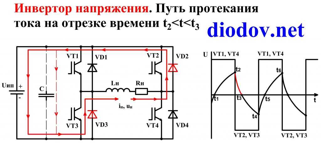 В связи с этим, на отрезке времени t2 – t3 ток будет протекать через диоды VD2 и VD3, сохраняя прежнее направление на RнLн, но пройдет в обратном направлении через Uип или конденсатор C, если источником энергии является диодный выпрямитель. Поэтому следует обязательно установить конденсатор C, если преобразователь подключен к диодному выпрямителю. Иначе прервется путь протекания iн, в результате чего возникнут сильное перенапряжение, которое может повредить изоляцию потребителя и выведет из строя полупроводниковые приборы.