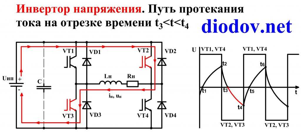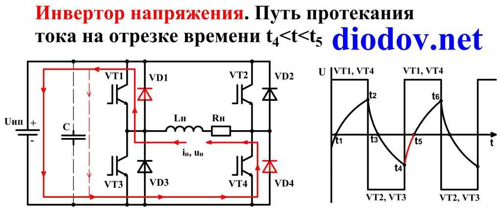 В точке t4, расположенной на оси времени t, снимается управляющий сигнал с VT1,3, а VT1 и VT4 открываются. Однако iн продолжает протекать в ту же сторону, пока не расходуется энергия, запасенная в индуктивности. Это будет происходить на интервале времени t4 – t5.