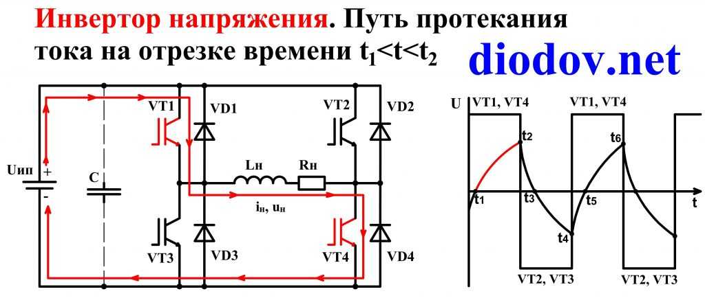 Начиная с момента t5 iн изменить направление и потечет от Uип через LнRн по пути через VT1 и VT4. Далее все процессы, протекающие в электрической цепи, будут повторяться. На LнRн форма напряжения будет прямоугольной, но ток на активно-индуктивной нагрузке будет иметь пилообразную форму за счет наличия индуктивности, которая не позволяет ему мгновенно вырасти и снизиться. Если потребитель имеет чисто активный характер (индуктивность и емкость практически равны нулю), то формы iн и uн будет в виде прямоугольников.