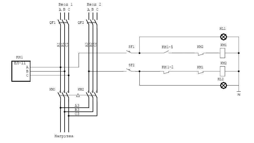Катушка пускателя КМ1 подключается через фазу L3 от первого ввода и через нормально замкнутый контакт КМ2. Таким образом, когда вы подаете питание на ввод №1, катушка первого пускателя замыкается и вся нагрузка подключается к источнику напряжения №1.