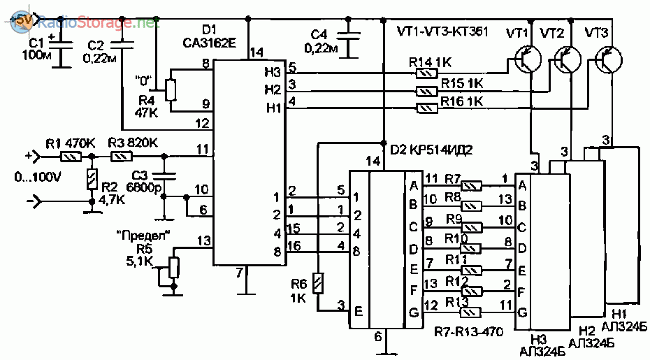 Рис. 1. Принципиальная схема цифрового вольтметра до 100В на микросхемах СА3162, КР514ИД2.