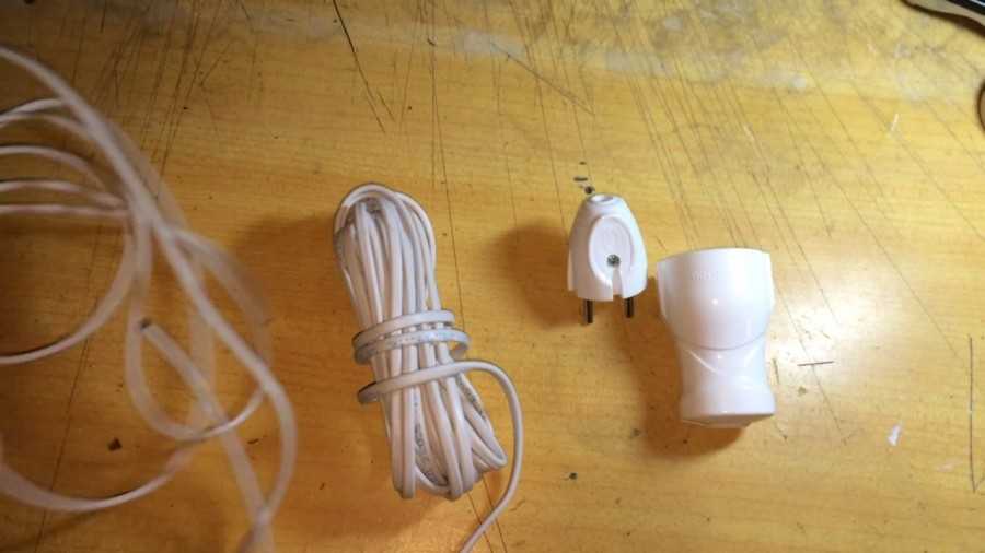 На первом этапе выполняется снятие с обеих сторон кабеля верхнего изоляционного слоя примерно на 5-7 см, после чего концы каждой жилы зачищаются на 1 см. Далее разбирается вилка путем выкручивания крепежного болтика. После этого нужно ослабить винты на хомутике, фиксирующем кабель внутри корпуса вилки. Затем выполняется подключение зачищенных проводов к двум вилочным контактам.