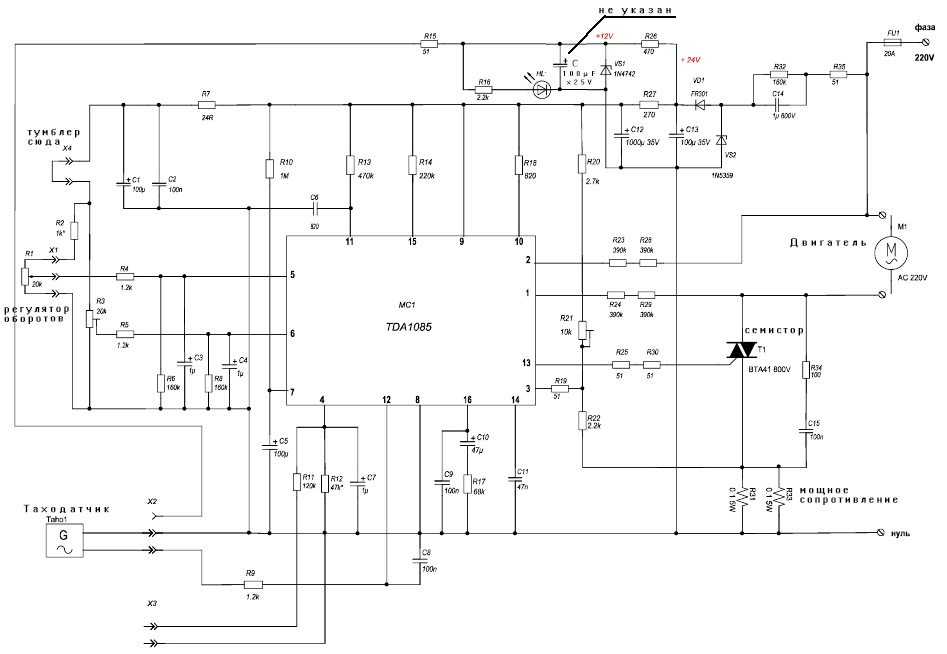 Пришло время вспомнить про таходатчик и его выходы, которые мы на двигателе нашли, но до поры отставили в сторону. Именно таходатчик поможет нам подключить двигатель стиралки и регулировать его обороты без потери мощности. Сам таходатчик управлять двигателем не может, он лишь посредник. Реальное управление должно осуществляться посредством микросхемы, которая соединяется с таходатчиком двигателя, обмоткой и якорем и запитывается от сети 220 В. Принципиальную схему вы можете видеть на рисунке ниже.