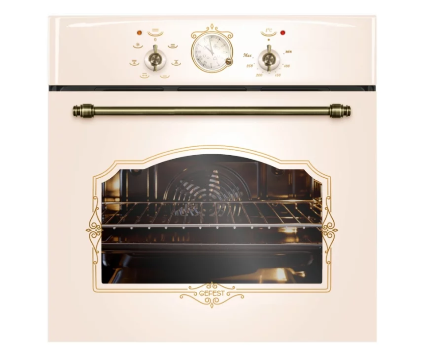 Недорогая модель ГЕФЕСТ по праву может называться одной из красивейших в обзоре. Но подойдёт она не в любой интерьер, а преимущественно в кухни с классическим стилем. Этот электрический духовой шкаф выделяется привлекательным бежевым цветом корпуса, удобной и красивой ручкой, а также необычно оформленными переключателями и часами в центре. Столь же эффектно оформлены подписи температуры и доступных режимов.
