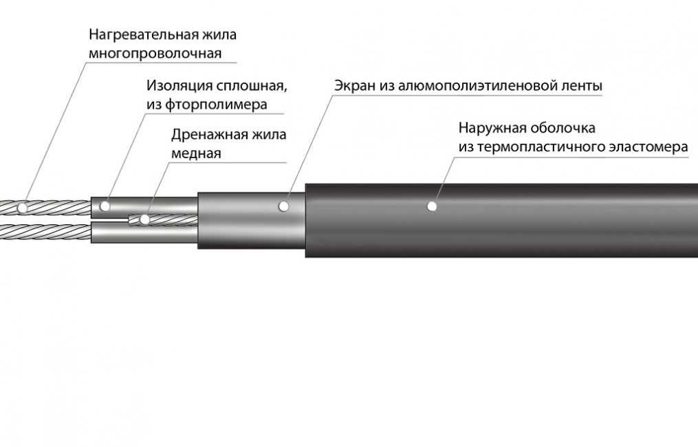 После достижения необходимой температуры система автоматически отключается. Сам кабель состоит из металлической жилы, обернутой изоляционным материалом. Из-за простоты устройства он обладает возможностью сохранения параметров в течение всего периода работы устройства, а также обладает высоким удельным тепловыделением.