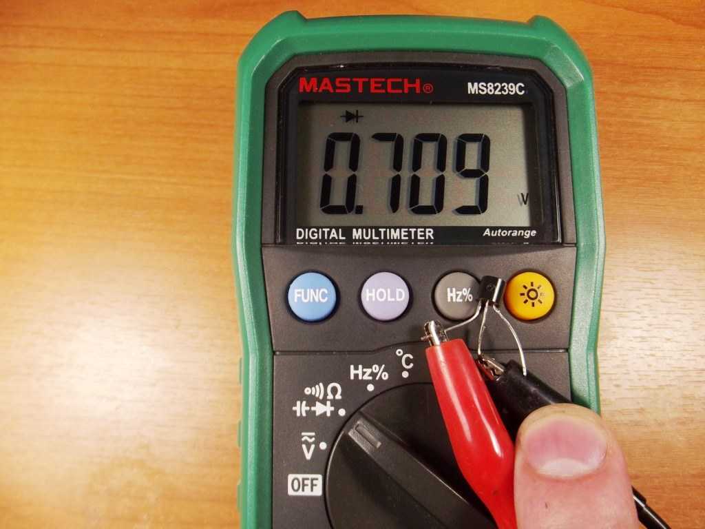 Проверка диодов с помощью цифровых мультиметров производится в режиме их тестирования. При этом, если диод исправен, на дисплее отображается напряжение на р-n переходе при измерении в прямом направлении или разрыв при измерении в обратном направлении. Величина прямого напряжения на переходе для кремниевых диодов составляет 0,5…0,8 В, для германиевых — 0,2…0,4 В. При проверке диода с помощью цифровых мультиметров в режиме измерения сопротивления при проверке исправного диода обычно наблюдается разрыв как в прямом, так и в обратном направлении из-за того, что напряжение на клеммах мультиметра недостаточно для того, чтобы переход открылся.