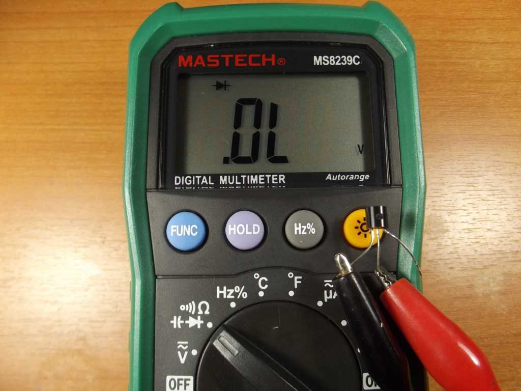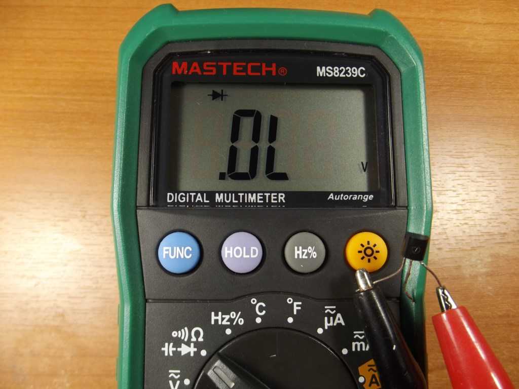 Как вы помните, диод пропускает электрический ток только в одном направлении. Поэтому, когда мы поменяем полярность и снова проверим диоды, то увидим на экране мультиметра очень большое сопротивление: