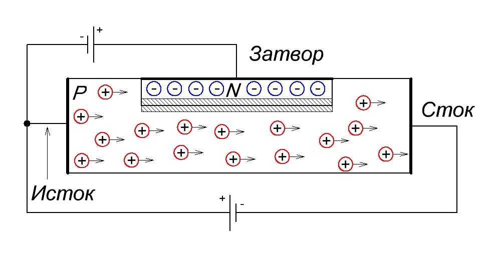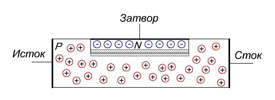 По достижению определенной концентрации электронов под затвором, между истоком и стоком создается тонкий n-канал, по которому потечет ток от истока к стоку.