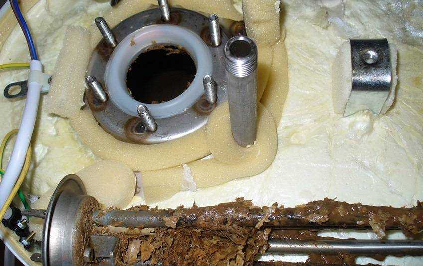 Когда фланец вместе с навешенными на него устройствами будет извлечен, вы наглядно сможете оценить качество водопроводной воды. Соскребите основную часть грязи с функциональных элементов прямо в бак и отложите до поры, к ТЭН’у и аноду вернемся несколько позже.