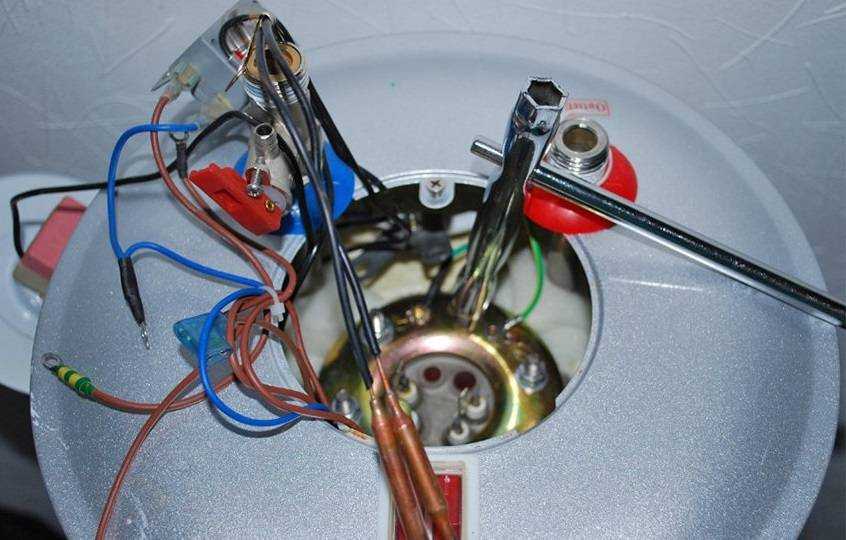 Внутри блока находится электрическая разводка: красный и синий провод, оконцованные клеммами, снимаем с контактов ТЭН’а, желто-зеленый отсоединяем, скрутив гайку заземления на корпус. Следом за ними отключаем провода термостата и регулятора температуры, снимаем тепловой проводник, который иногда выполнен в виде обычного однопроволочного медного провода.